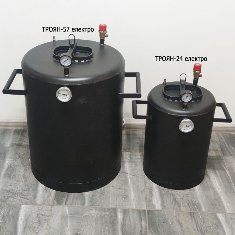 Процес стерилізації консервованої продукції в скляній тарі - відповідальний і важливий момент. Автоклав Троян-57 електричний може відтворити заводські технології термообробки на кожній кухні. Автоклав виготовлений з чорної сталі товщиною 3 мм (кришка 4 мм). За нагрівання відповідає ТЕН італійської фірми THERMOWATT та вітчизняний терморегулятор Троян. Все, що потрібно - встановити терморегулятор на потрібний режим роботи (відповідно до рецептури) і терморегулятор запустить і зупинить нагрівання в потрібний момент. Відмінною особливістю автоклава є зручна та надійна кришка. Вона притискається від руки лише одним болтом, на відміну від старих автоклавів на 7-8 гайок. Далі зростаючий тиск притискає кришку зсередини, рівномірно розподіляючи тиск по всій поверхні кришки. Всі автоклави проходять перевірку на герметичність тиску 8 Bar (робочий тиск 4 Bar).