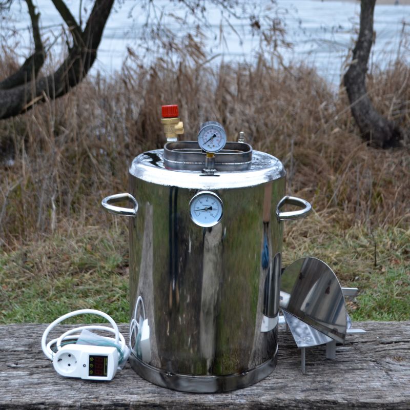 Процес стерилізації консервованої продукції в скляній тарі - відповідальний і важливий момент. Автоклав ЛЮКС-16Е здатний відтворити заводські технології термообробки на кожній кухні. Автоклав виготовлений із харчової нержавіючої сталі марки AISI304 завтовшки 2 мм., (кришка 4 мм). За нагрівання відповідає ТЕН італійської фірми THERMOWATT та вітчизняний терморегулятор. Необхідно лише встановити терморегулятор на потрібний режим роботи (відповідно до рецептури) і він запустить та зупинить нагрівання в потрібний момент. Особливістю автоклавів серії ЛЮКС є зручна та надійна кришка. Вона притискається від руки лише одним баранчиком (гайкою), на відміну від старих автоклавів на 7-8 гайок. Далі кришка придавлюється тиском зсередини, та рівномірно розподіляє тиск по всій поверхні кришки. Всі автоклави проходять перевірку на герметичність з тиском 8 Bar (робочий тиск 4 Bar).