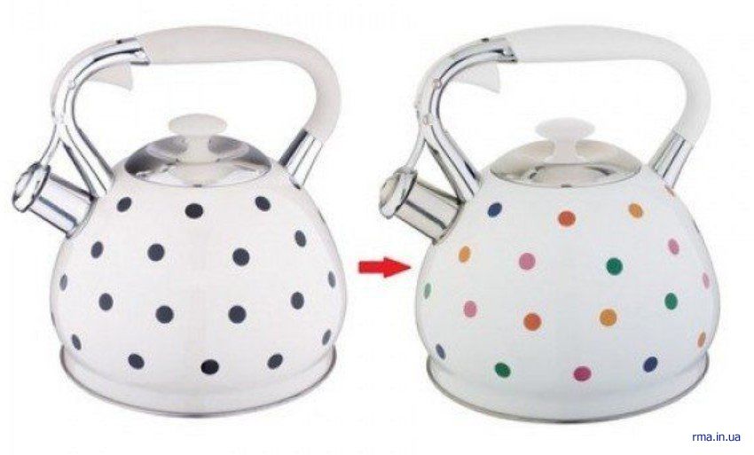 EDENBERG EB-1908 - металлический чайник со свистком объёмом 3 литра и 2-х слойным капсульным дном. Но фишка чайника в том, что при нагреве изменяется цвет рисунка, т.е. чёрные полосы изменяются на разноцветные.