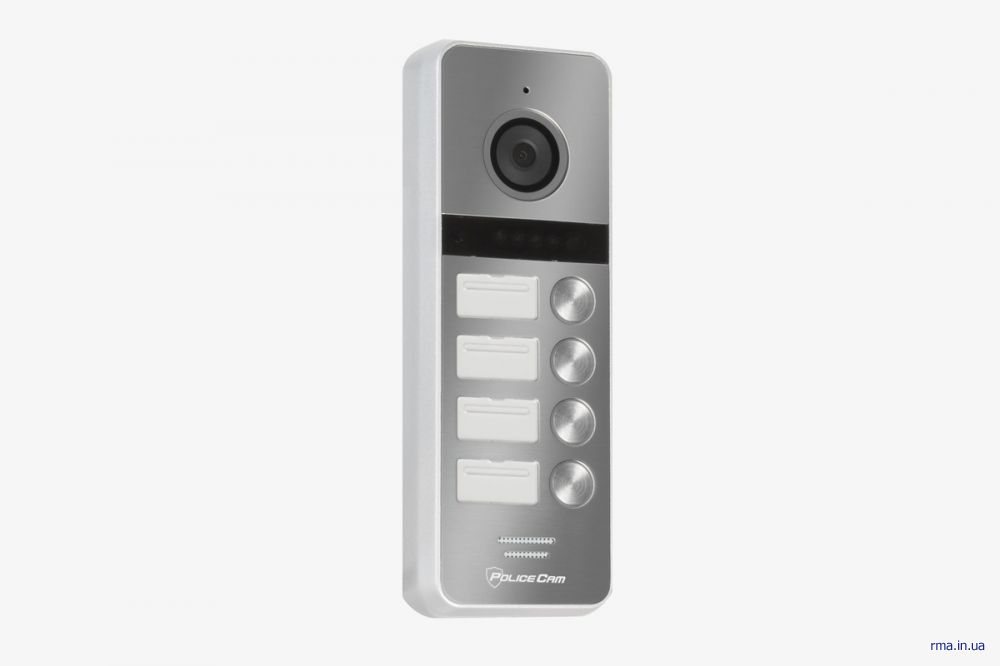 PoliceCam PC-207-4 - стильна виклична панель на 4 абонента для цифрових відеодомофонів. Відрізняється широким кутом огляду до 90 °. Важлива особливість - міцний металевий корпус, стійкий до зовнішніх впливів. на передній панелі знаходяться 4 кнопки виклику. Поряд з кожною кнопкою визова- спеціальні осередки для вказівки номера квартири або офісу Панель безперебійно працює незалежно від погодних умов.