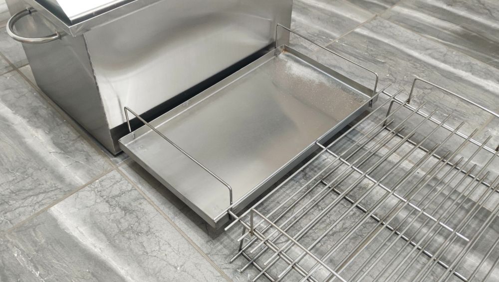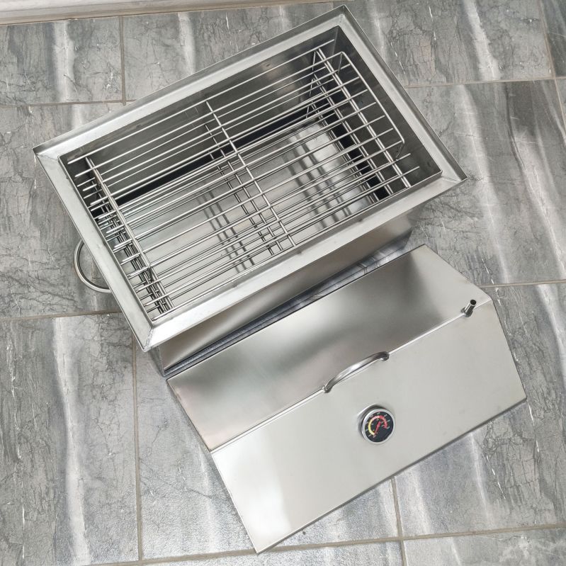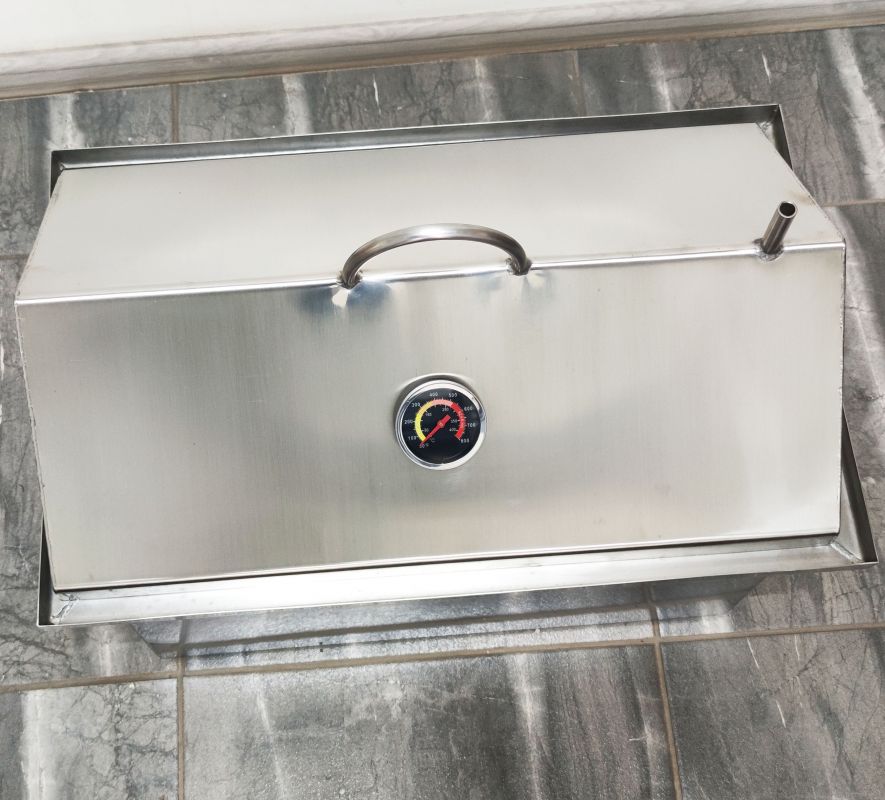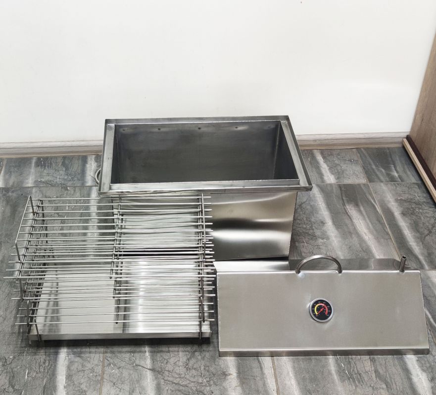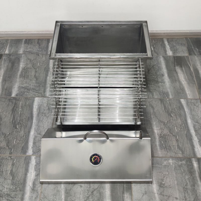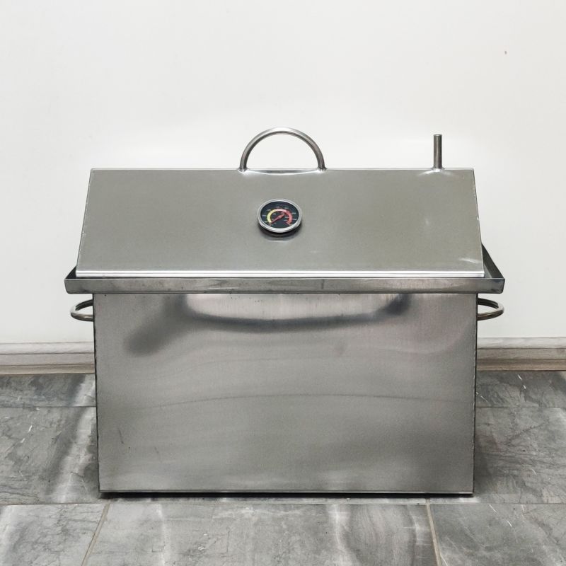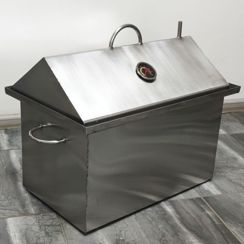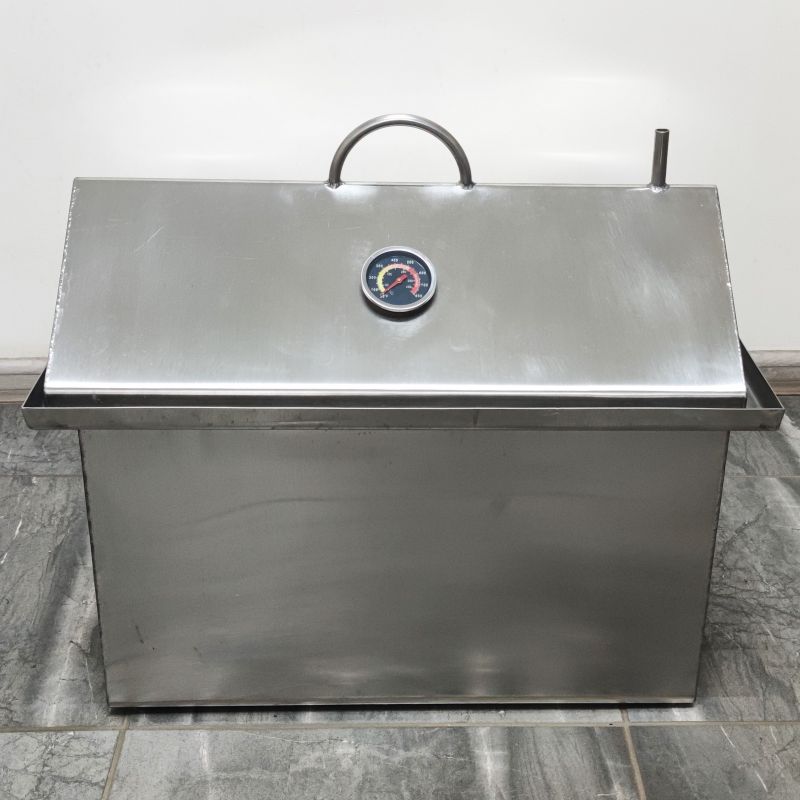Коптильня із гідрозасувом для гарячого копчення. Виготовлена з харчової нержавіючої сталі завтовшки 1,5 мм, 3-х ярусна. Складається з коптильні (ящика), піддону для збирання жиру (на дно) та 3-х сіток для укладання продуктів. Кришка коптильні виконана у формі будиночка для того, щоб конденсат, який накопичуватиметься нагорі при копченні, не капав на продукти - він стікатиме з боків.