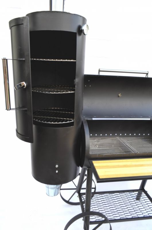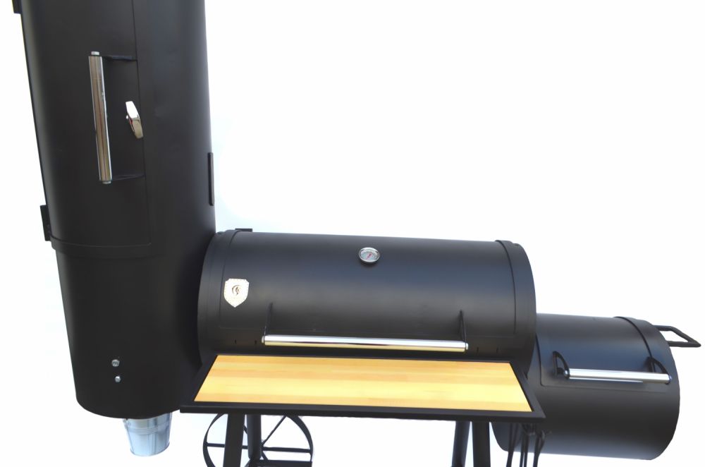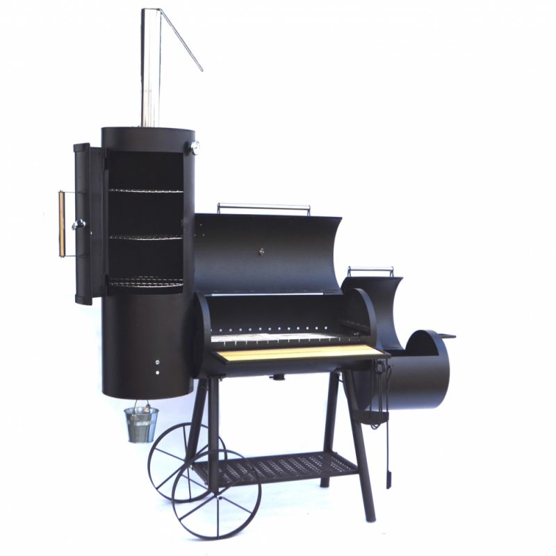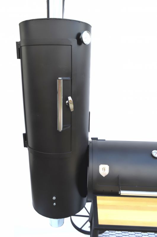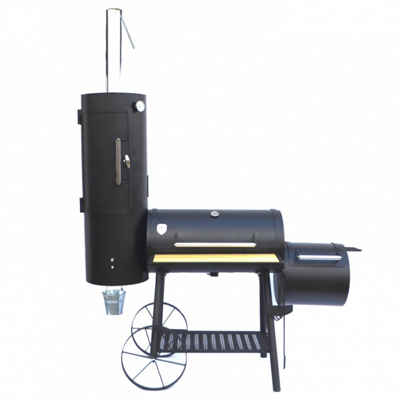 У комплекті є спеціальні фіксатори, використовуючи які можна легко дістати ящик для вугілля. Всі решітки виготовлені із харчової нержавіючої сталі. Є заріз під шампура (на 14 шампурів). Нержавіючий димовідвід 0.5 м з нержавіючим вентиляційним заслоном зверху. Зручна ручка вентиляційного заслону. Передня приставна стільниця з натурального дерева, лакована (у металевій окантовці). Знизу полиця для дров із металу. Зручні колеса для переміщення територією. У камері холодного копчення є 4 гачки зверху для підвісу продукції, а також 3 нержавіючі полиці.