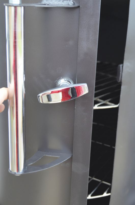Камера холодного копчення закривається спеціальним важелем, який щільно підтискає дверцята. Є можливість вимірювання температури в камері гарячого копчення та в камері холодного копчення окремо. Пофарбовано якісною вогнестійкою фарбою чорного кольору.
