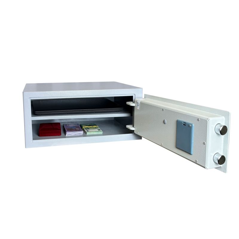 Меблевий сейф S.20.E GREY Laptop призначений для надійного зберігання ноутбука з діагоналлю до 15,6 дюймів та інших цінних речей. Габаритні розміри сейфа дозволяють зручно розміщувати його в шафі, тумбі або на столі. Товщина металу дверей і корпусу становить 3 мм. Має одну пересувну полицю, яка розділяє простір сейфу навпіл. Оснащений електронним кодовим замком.
