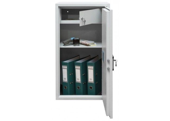 Офісний сейф GUTE PN-87T має знімну полицю, завдяки якій внутрішній простір розділений на два відсіки. А його габарити дозволяють покласти документи формату А4 або папку "Корона", а також інші цінності, які можна зберігати як в офісі так і вдома. Сейф укомплектований касовим відділенням (трейзером), що замикається на ключ.