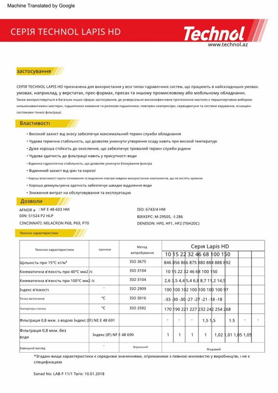 Гидравлическая жидкость Technol Lapis HD 68, 208л