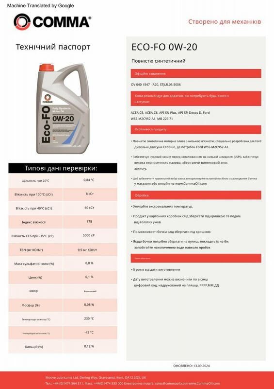 Comma рекомендує використовувати цей продукт у таких випадках: MB 228.1, MB 229.1; VW 50101, VW 50500; ACEA A3/B3; API SL CF CG-4