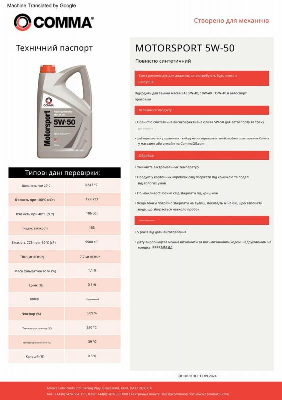 Моторне масло Comma MOTORSPORT 5W-50 1л