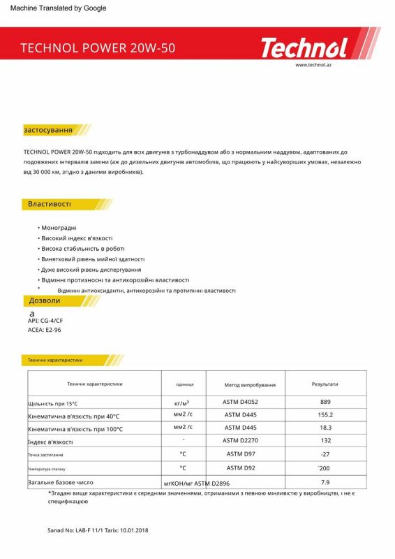 - Лужне число T.B.N.: 8,3 мг КОН/г