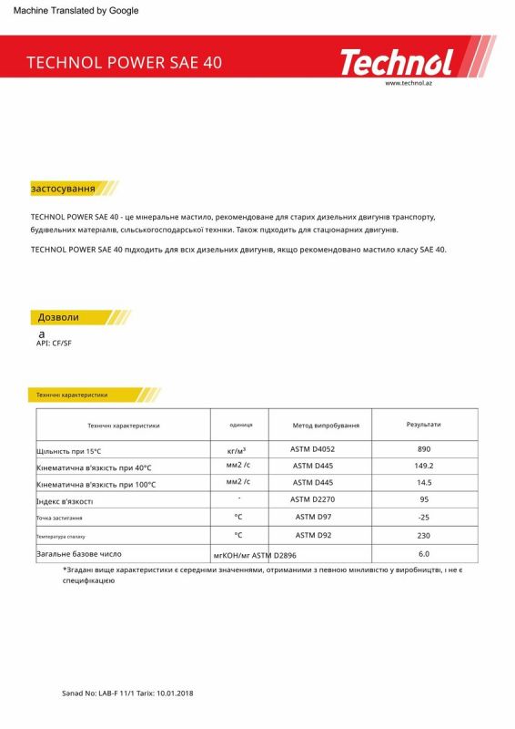 - Лужне число T.B.N.: 10,0 мг КОН/г