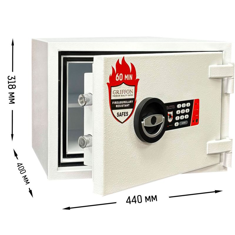Вогнестійкі характеристики сейфа підтверджені сертифікацією LFS 60P (ДСТУ EN 15659), що гарантує захист вмісту протягом 60 хвилин за умов високотемпературного впливу. Двостінна конструкція з подвійним порогом у поєднанні з теплоізоляційним наповнювачем формує надійний захисний контур. Шар захисту товщиною 53 мм разом із двома контурами термострічки навколо дверей перешкоджає проникненню жару, диму та полум’я всередину сейфа. Доступ до вмісту здійснюється через електронний кодовий замок GRIFFON 2.0, розроблений в Україні.