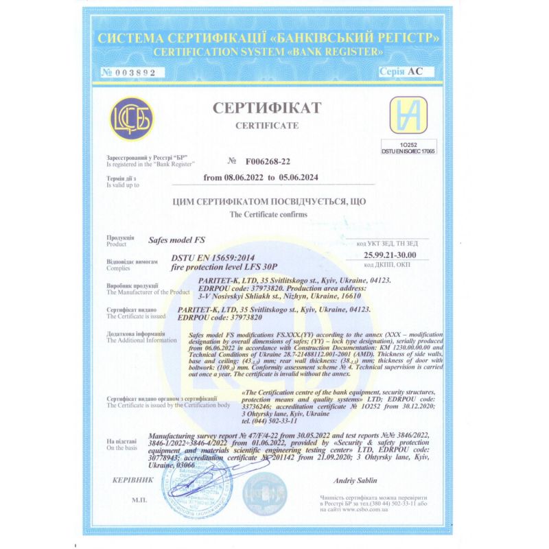 Сейфи сертифіковано по класу LFS 30P по ДСТУ EN 15659.