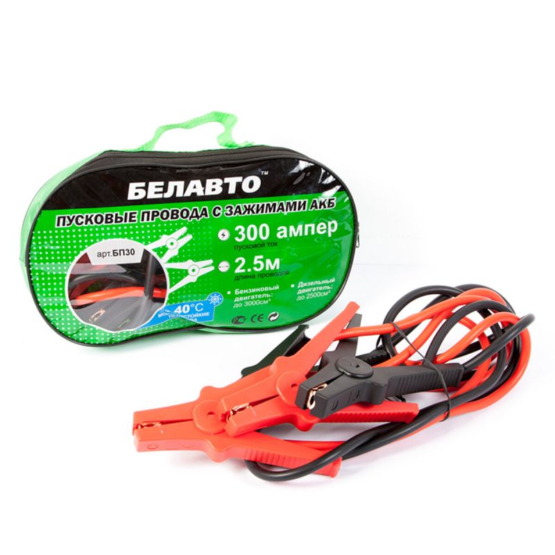 Пусковий струм: 300А; Довжина кабелю: 2.5м; Для двигунів: до 3000 см. куб. Країна походження: Польща Упаковка: зручна сумка