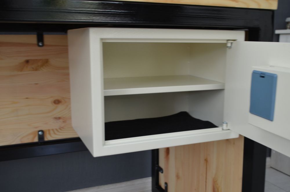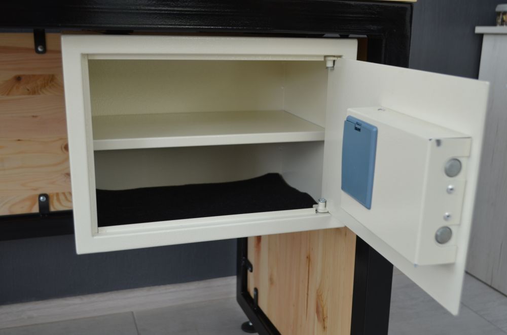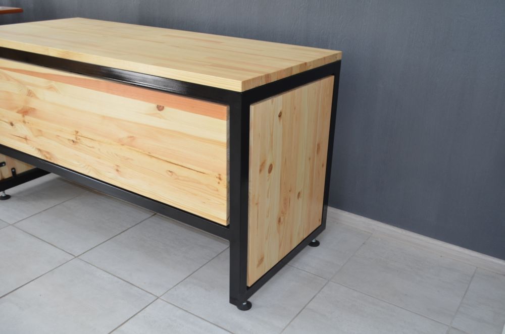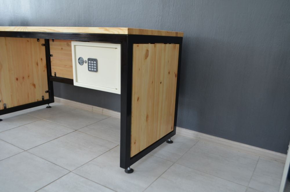 Сучасний офісний стіл у стилі лофт із надійно закріпленим сейфом до столу. Кріплення сейфа надійно фіксує його до основи столу в 4-х точках і додатково 2-ма гайками. Щоб демонтувати сейф, потрібно лише відкрити його. Висота столу регулюється зручними ніжками.