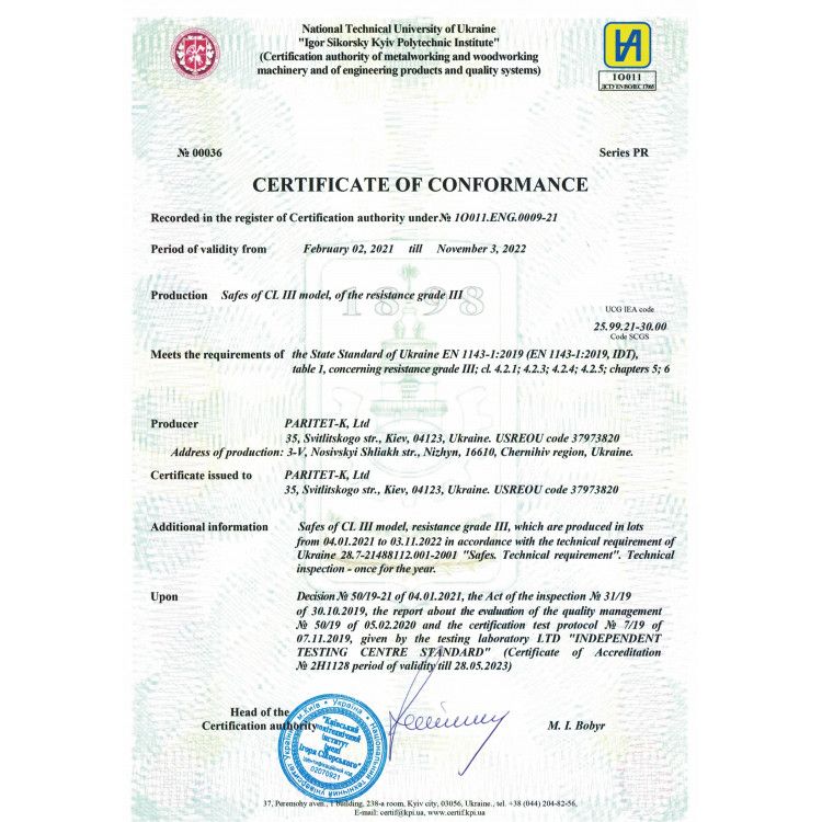 Огневзломостойкие сейфы TM Griffon серии CL III сертифицированы по третьему классу ДСТУ EN 1143-1 и имеют толщину защитного слоя - 40 мм. Отвечают классу огнестойкости LFS 30P по ДСТУ EN 15659.
